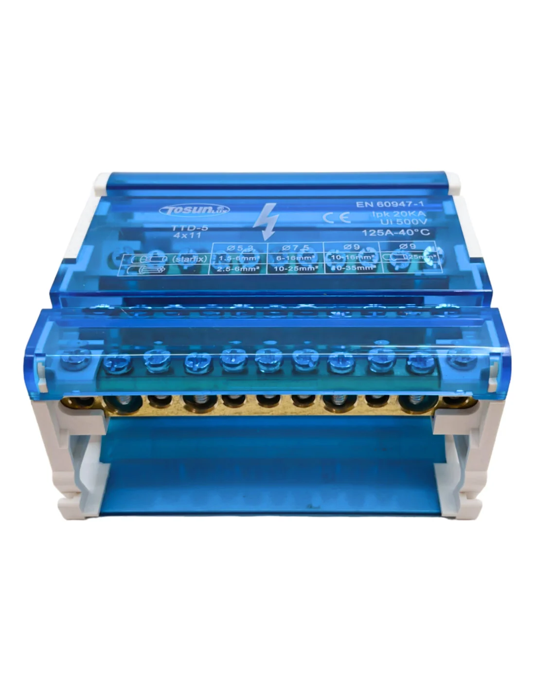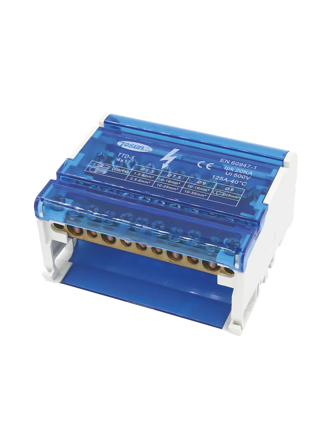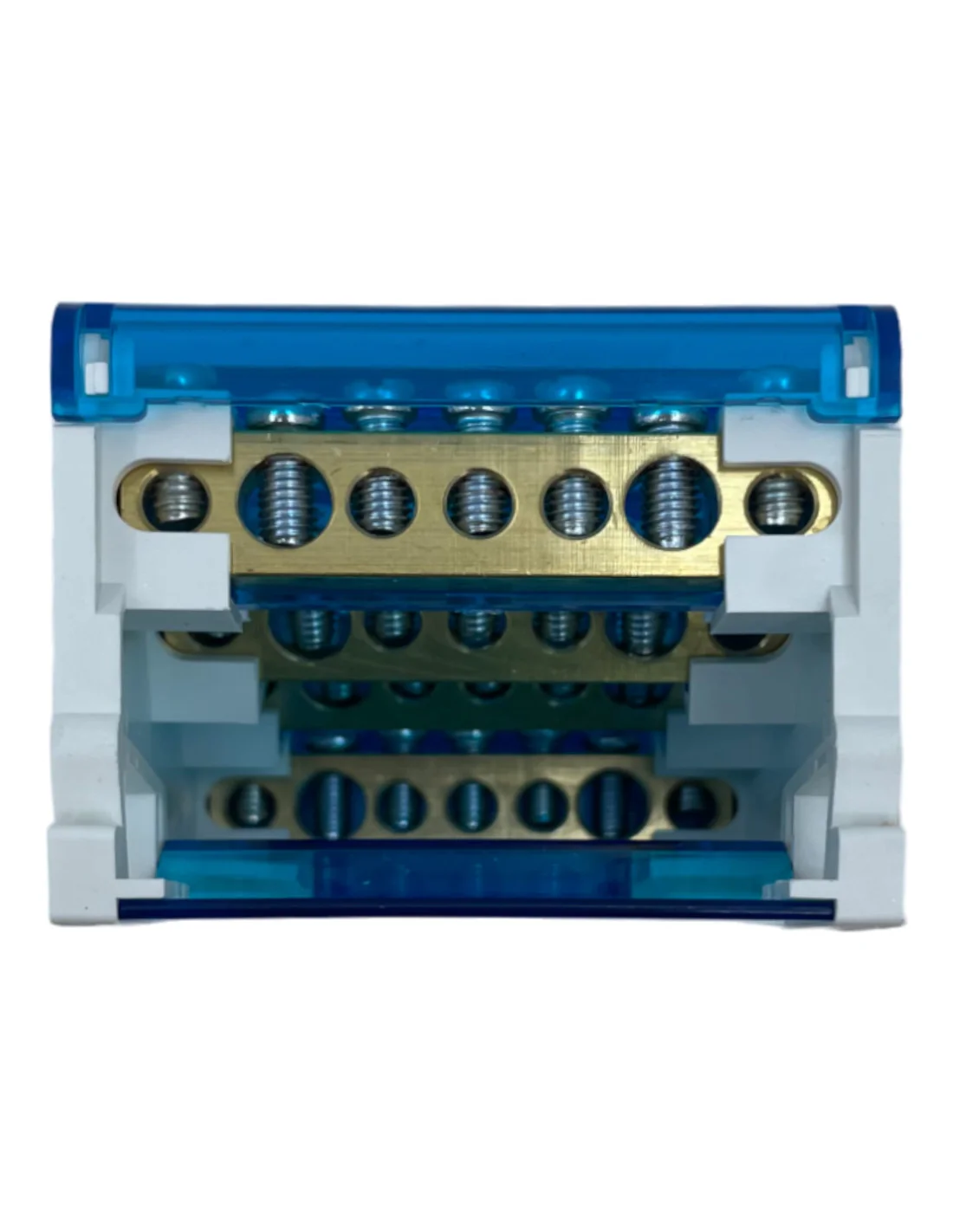 Diseñado para aplicaciones de mayor capacidad, este bloque de distribución permite gestionar un mayor número de conexiones de hasta 125A, siendo adecuado para instalaciones comerciales o industriales de tamaño medio.
