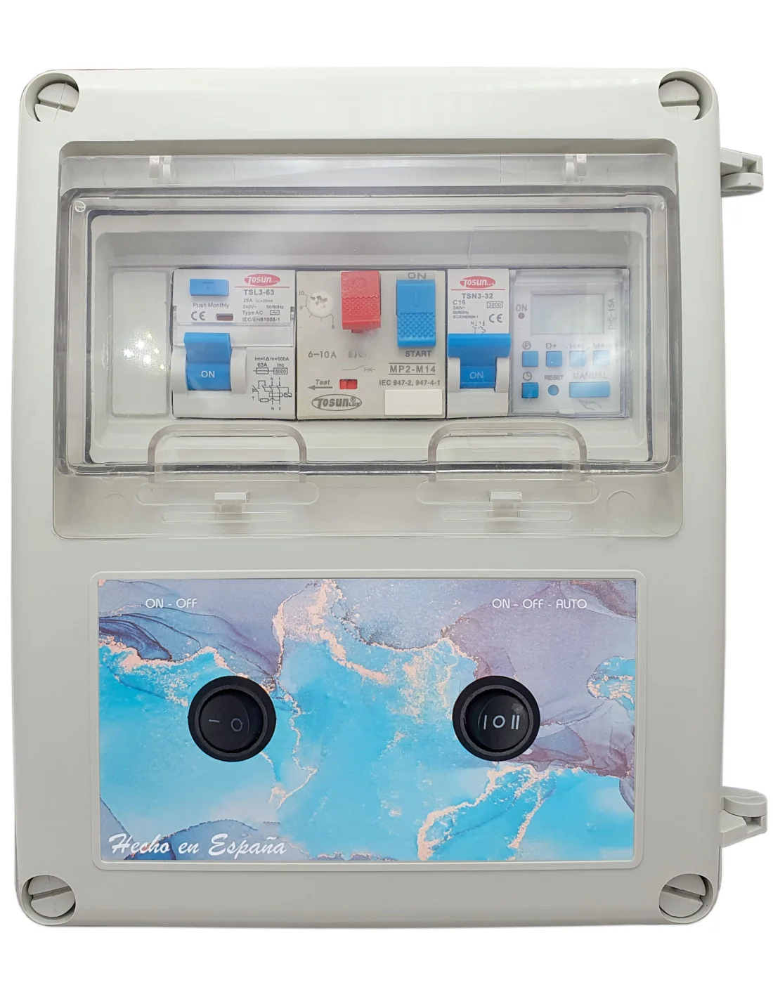 La caja estanca con certificación IP65 protege todos los componentes frente a humedad, lluvia, polvo y radiación solar. Perfecto para su instalación en casetas técnicas, exteriores o zonas próximas a la piscina.