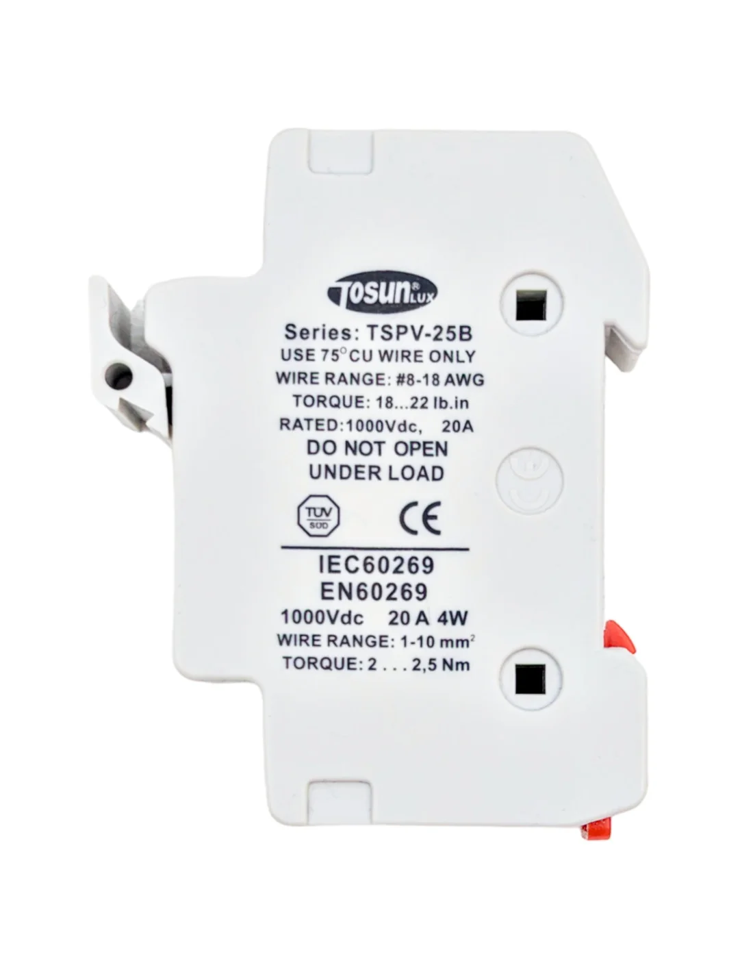 El portafusible para fotovoltaica TSPV-25B está meticulosamente diseñado para ofrecer una solución de seguridad avanzada en el ámbito de la energía renovable. Su estructura y funcionalidades lo hacen esencial para cualquier instalación que utilice placas solares, garantizando una protección óptima y eficiente.