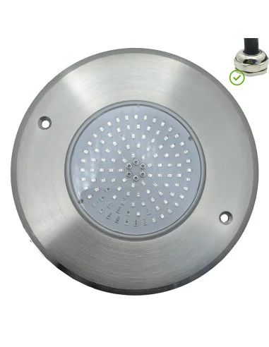 Fabricado en acero inoxidable, el foco es resistente a condiciones adversas, asegurando una larga vida útil. Su diseño completamente plano, con menos de 2 cm de grosor, lo hace discreto y elegante, integrándose perfectamente en cualquier entorno de piscina.