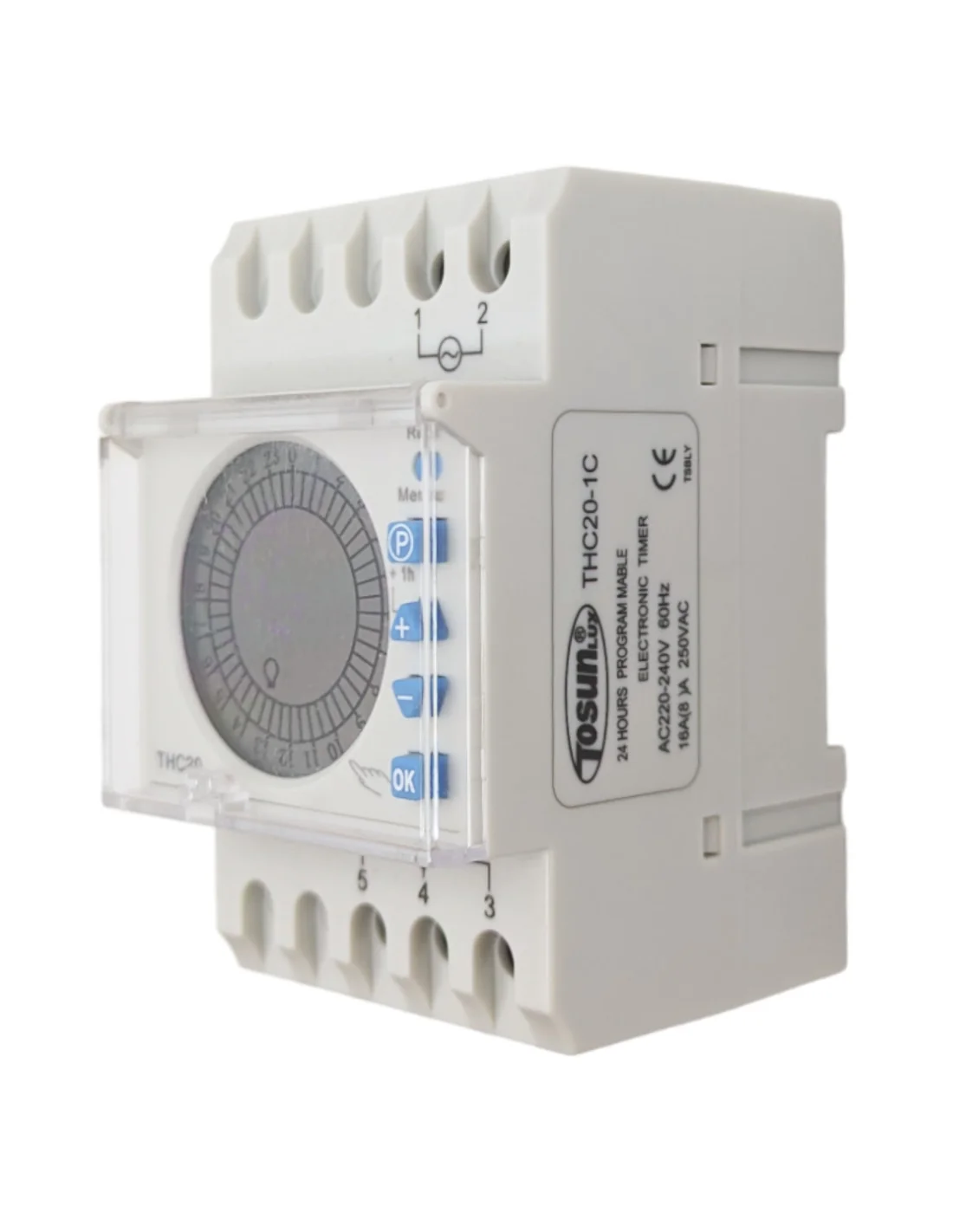 El Interruptor Temporizador THC20-1C de Tosunlux es una solución innovadora para gestionar el uso eficiente de la energía en tu hogar o negocio. Diseñado para facilitar la programación horaria, este dispositivo es clave en sistemas que requieren control preciso del tiempo y optimización del consumo eléctrico.